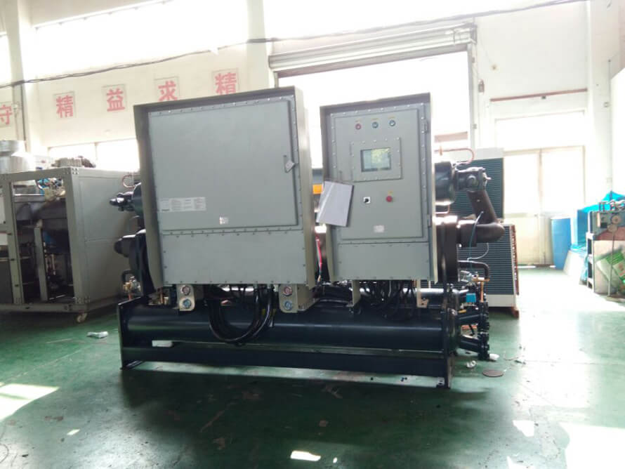 2、防爆型鹽水螺桿式制冷機組:控制器根據 GB3836.1-2000 《爆炸性氣體環境用電氣設備 通用要求》、GB3836.2-2000《爆炸性氣體環境用電設備 隔爆型“ d ”》和 GB3836.3-2000《爆炸性氣體環境用電氣設備 增安型“ e ”》 的規定而設計制造。能夠滿足工藝的特殊要求;